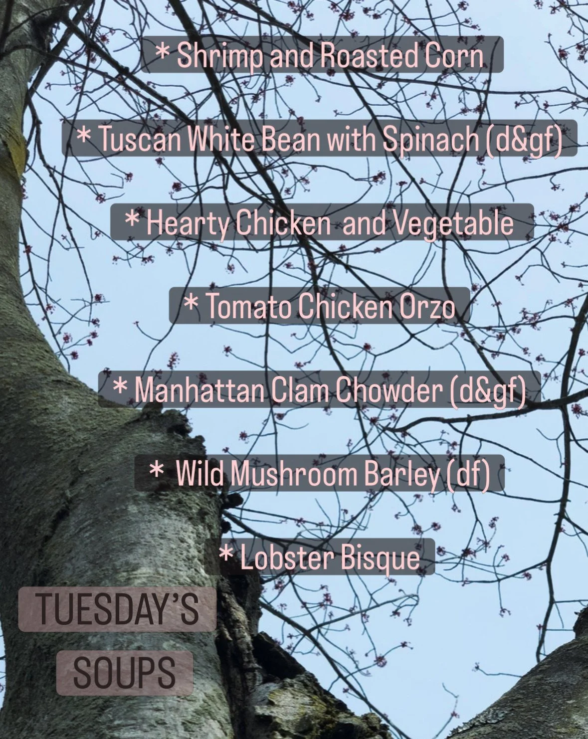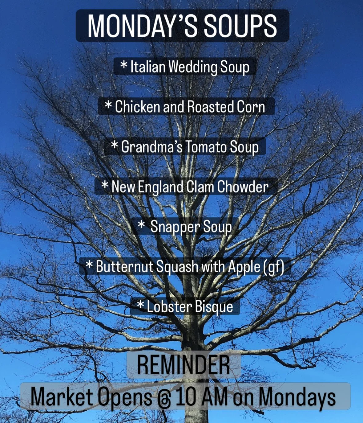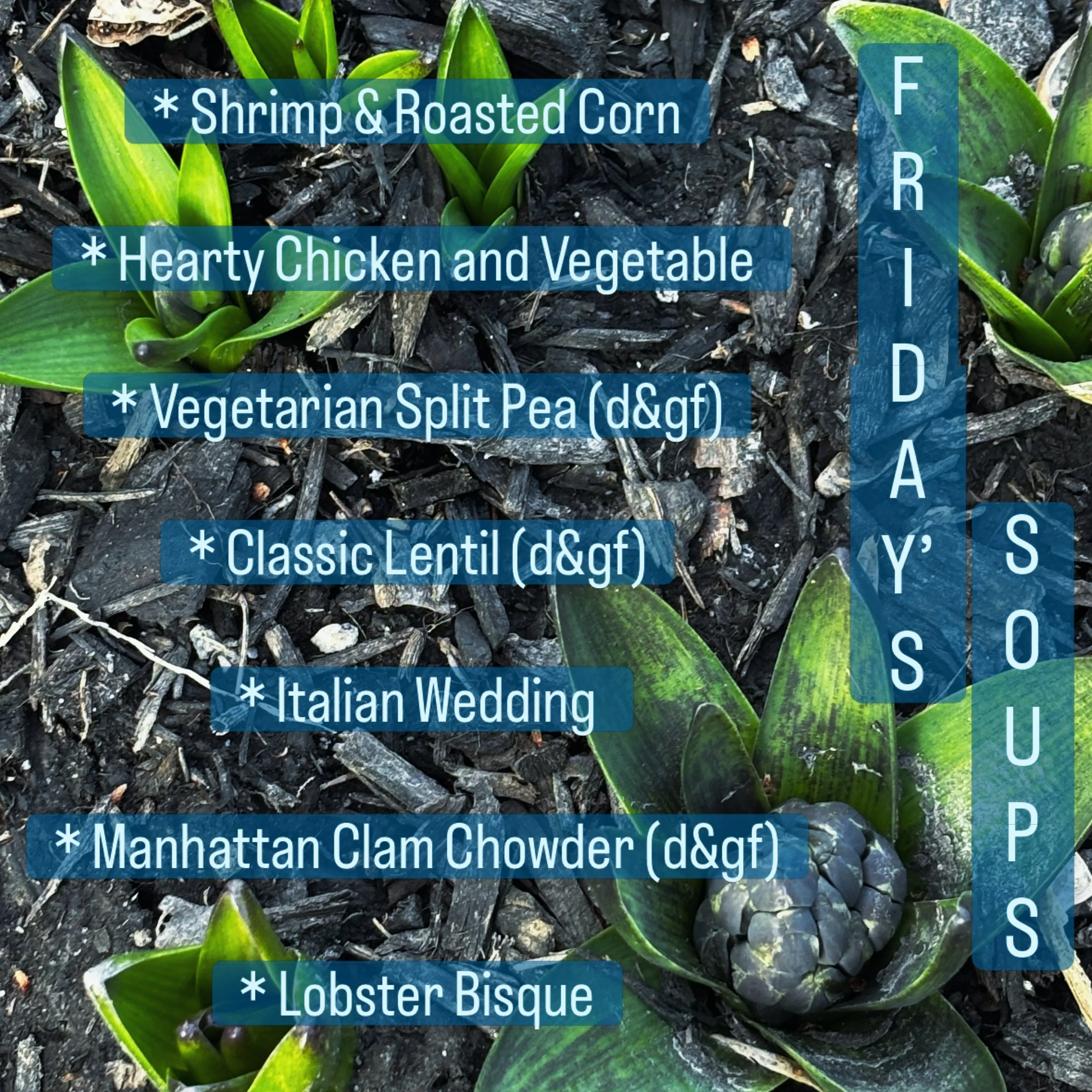 Made Daily. Check out our Instagram/Facebook posts or look at the Welcome Section here on our website, for daily list